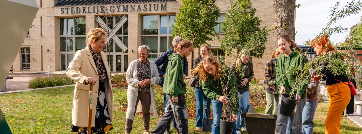 In Breda leiden leerlingen uit het eco-team en docent en duurzaamheidscoördinator Ragne van Engelen de gasten rond over het groene schoolplein. “We hebben het stenen schoolplein omgetoverd tot een plein met veel groen en onder andere een mussenhotel, herplaatste bomen van de gemeente Breda, een groen dak en een groene parkeerplaats. We hebben nog veel meer plannen, bijvoorbeeld groene fietsenrekken en een buitenlokaal. Wat het plein echt bijzonder maakt is de buurtfunctie, niet alleen leerlingen en docenten kunnen genieten, maar ook de buurt maakt gebruik van het plein,” vertellen de leerlingen en Ragne enthousiast. De school sleepte de afgelopen jaren al verschillende prijzen in de wacht, waaronder de Zilveren Vlag in 2024.