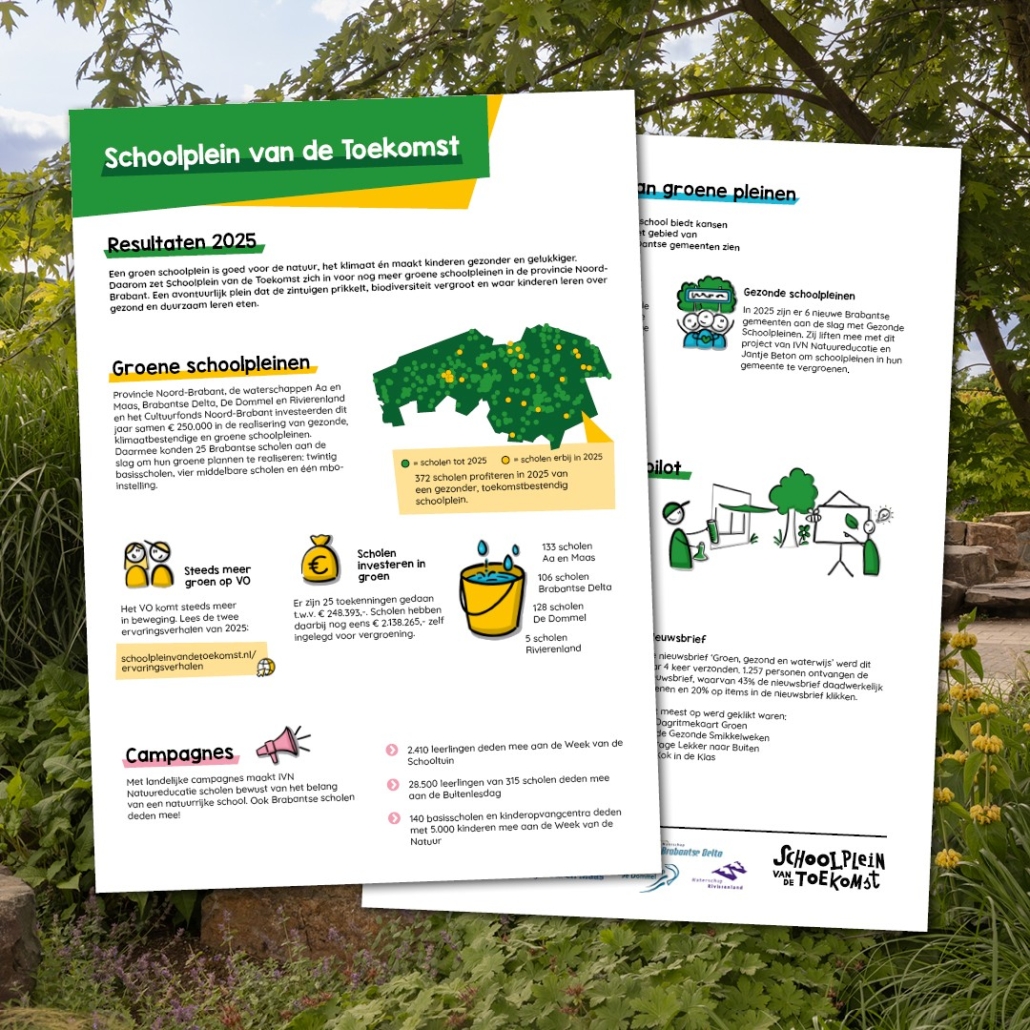 Daarnaast maakte IVN Natuureducatie Brabantse scholen bewust van het belang van een natuurrijke school met diverse campagnes, zoals de Buitenlesdag en Week van de Natuur. Ook gemeenten droegen bij, zo gingen er 6 nieuwe Brabantse gemeenten aan de slag met Gezonde Schoolpleinen. En leerlingen van twee VO-scholen dachten tijdens een Jongeren Adviesbureau na over het vraagstuk hoe een ‘Middelbaar Schoolplein van de Toekomst’ eruitziet.