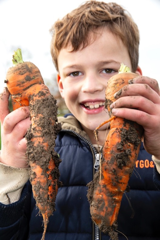 Na een warme zomer, waarin water geven soms lastig was, mochten de kinderen eindelijk oogsten. Sommige wortels waren klein, maar dat mocht de pret niet drukken. Foto’s van trotse kinderen met hun oogst stroomden binnen. Petra daagde scholen uit om hun oogst te delen, want in oktober wachtte een beloning: een gratis excursie naar bioboer Ronald Hoogendijk van het BIOTrio in Zevenbergen.
