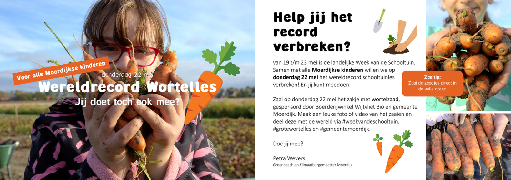 Tijdens de ondersteunersbijeenkomst van de Alliantie Schooltuinen ontstond bij Petra het idee om álle kinderen van Moerdijk uit te dagen mee te doen aan de wereldrecordpoging wortelles. Door zelf te zaaien, verzorgen en oogsten ontdekken kinderen dat groenten niet uit de supermarkt komen, maar met veel zorg geteeld worden door onze boeren. Het project sluit aan bij thema’s als natuurbeleving, duurzaamheid en gezonde voeding. Thema’s waar bij Petra, als klimaatburgemeester, haar focus ligt en hoopt jong en oud in Moerdijk te inspireren.